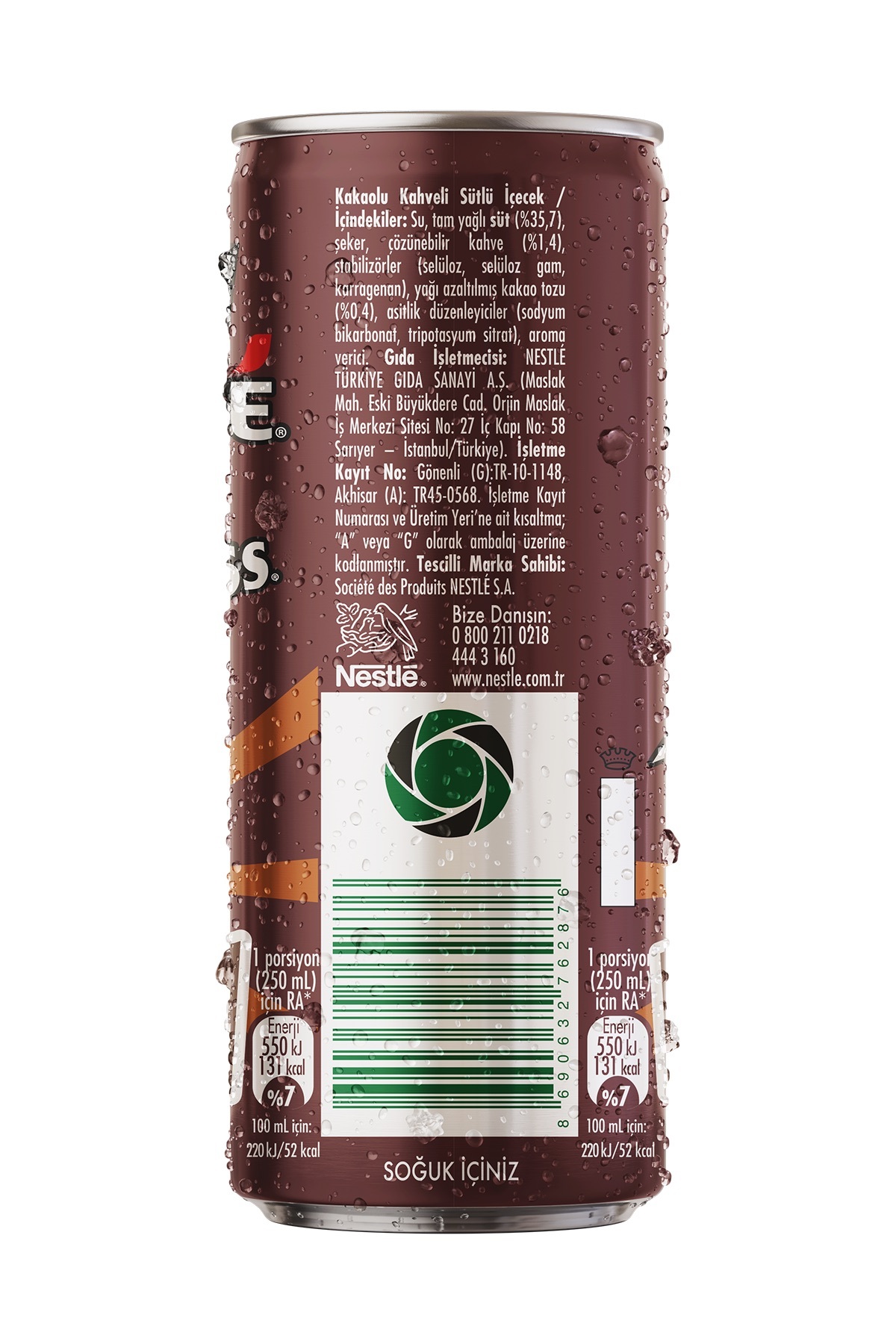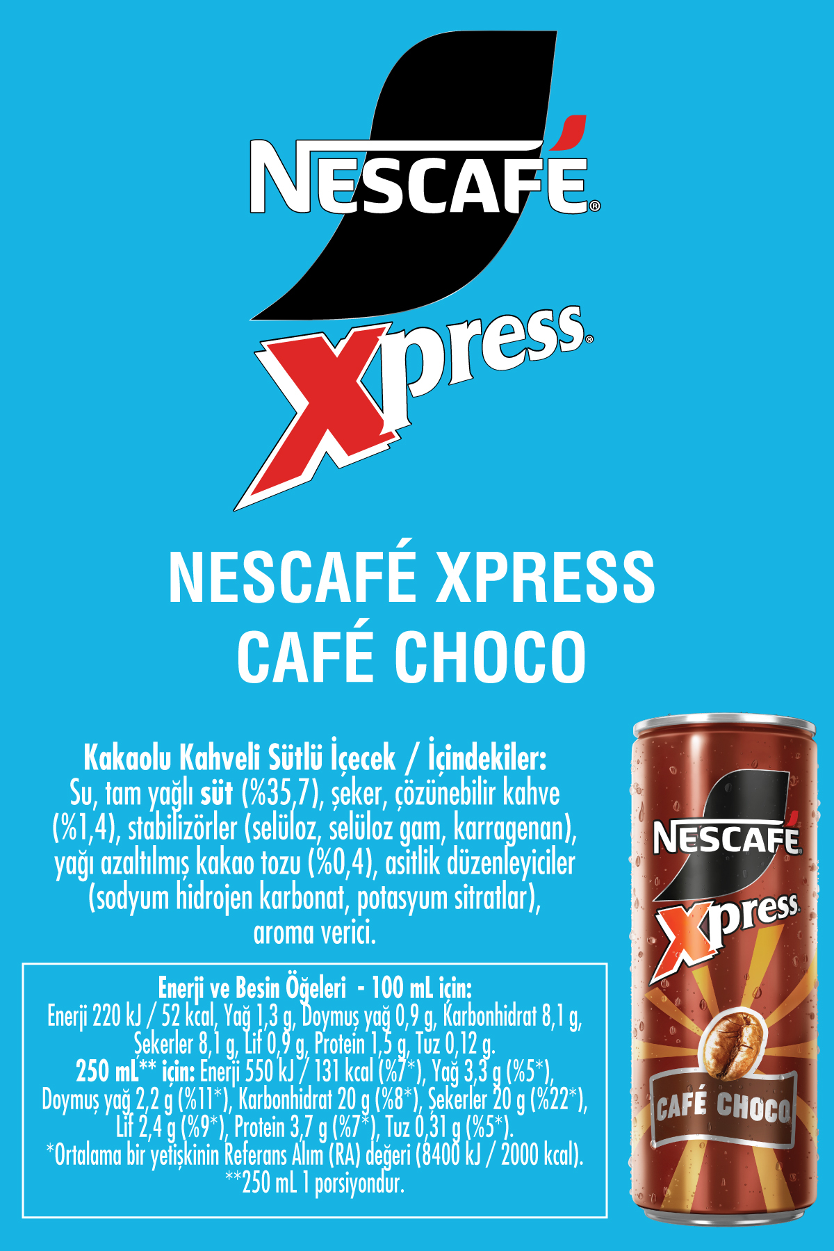 NESCAFÉ XPRESS Café Choco Soğuk Kahve 250ml x24;NESCAFÉ Xpress Café Choco 24x250 Ml. NESCAFÉ Xpress Café Choco, enfes sütlü kahve ve çikolata aromasıyla canlanma sağlar, günün yoğunluğunu unutturur.;İçindekiler: Su, tam yağlı süt (%35,7), şeker, çözünebilir kahve (%1,4), stabilizörler (selüloz, selüloz gam, karragenan), yağı azaltılmış kakao tozu (%0,4), asitlik düzenleyiciler (sodyum bikarbonat, tripotasyum sitrat), aroma verici.;Besin Değerleri (100 mL): Enerji (kJ/kcal): 220 / 52 , Yağ (g): 1,3 , Doymuş yağ (g): 0,9 , Karbonhidrat (g): 8,1 , Şekerler (g): 8,1 , Lif (g): 0,9 , Protein (g): 1,5 , Tuz (g): 0,12;Alerjen Uyarısı: Gluten içermez.