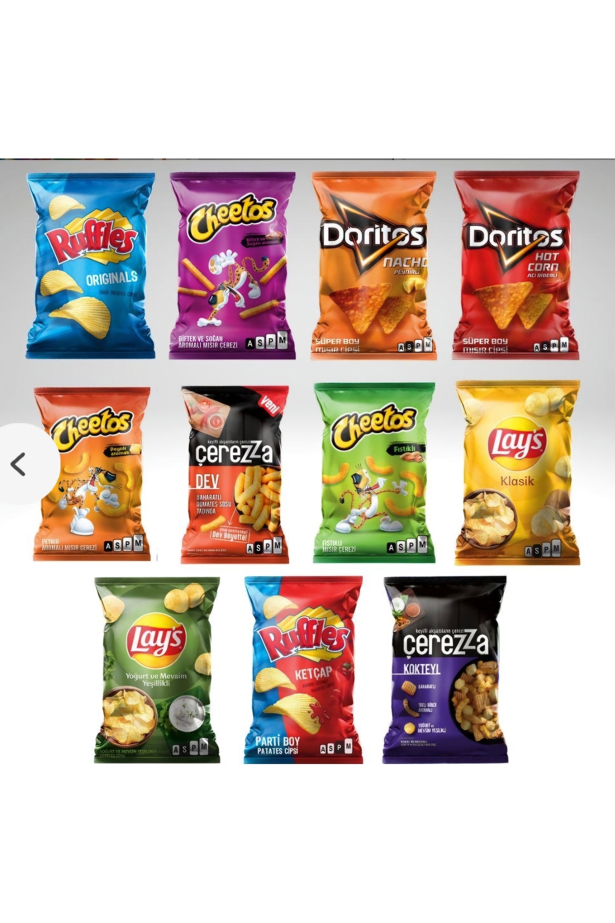 Karma Paket 1 Adet Ruffles Originals Süper 107 Gr 1 Adet Cheetos Peynirli Medium 40 Gr 1 Adet Cheetos Fıstıklı Medium 40 Gr 1 Adet Cheetos Biftek Medium 40 Gr 1 Adet Lay's YMY Süper 107 Gr 1 Adet Lay's Klasik Süper 107 Gr 1 Adet Doritos Nacho Süper 113 Gr 1 Adet Doritos HotCorn Süper 113 Gr 1 Adet Çerezza Kokteyl Süper 117 Gr 1 Adet Çerezza Dev Baharatlı Domates Sosu Tadında Parti 150 Gr 1 Adet Ruffles Ketçaplı Süper 150 Gr